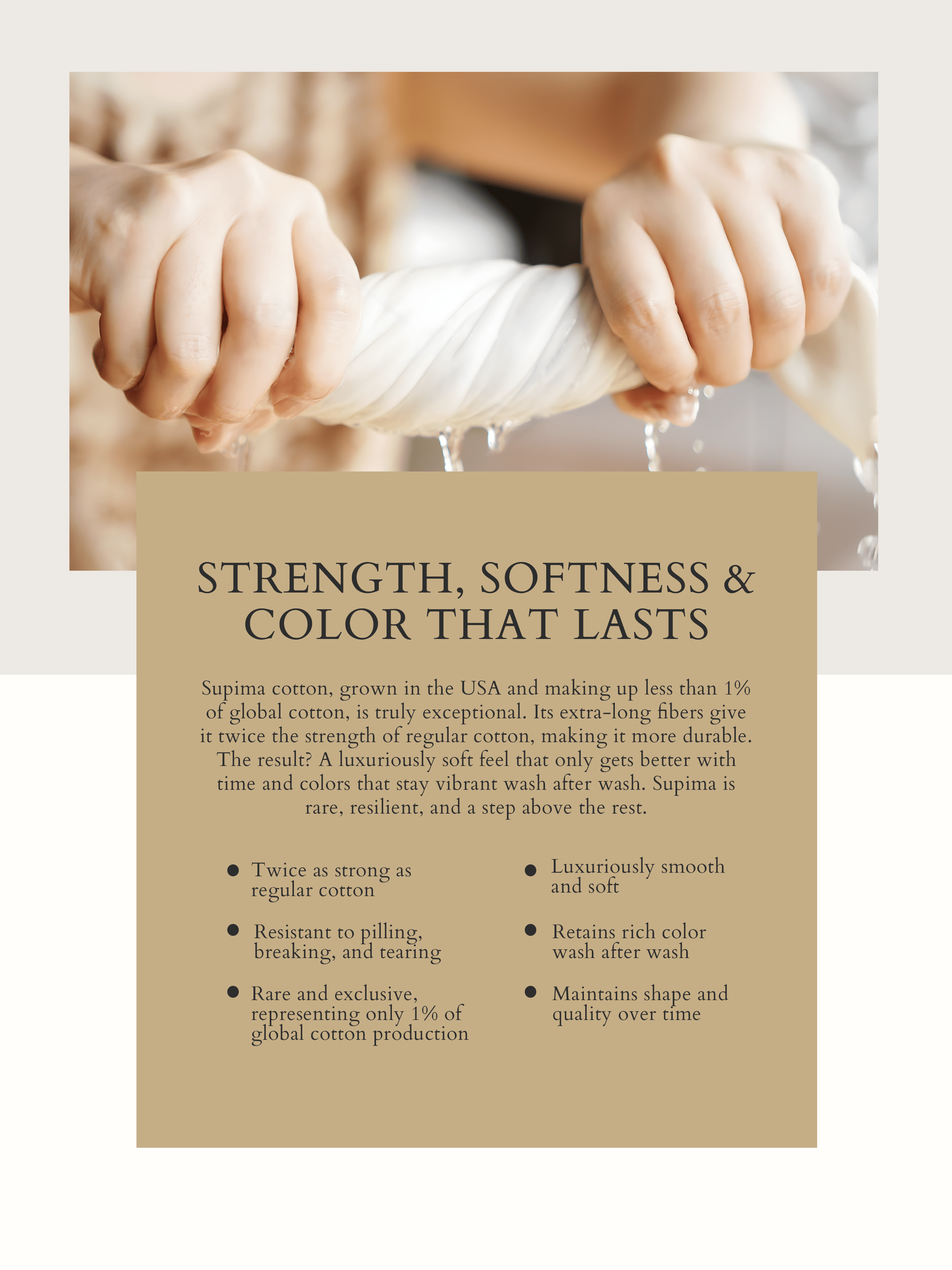 With fibers 35% longer and 45% stronger than regular cotton, Supima cotton is highly resistant to pilling, fraying, and wear, ensuring long-lasting quality.