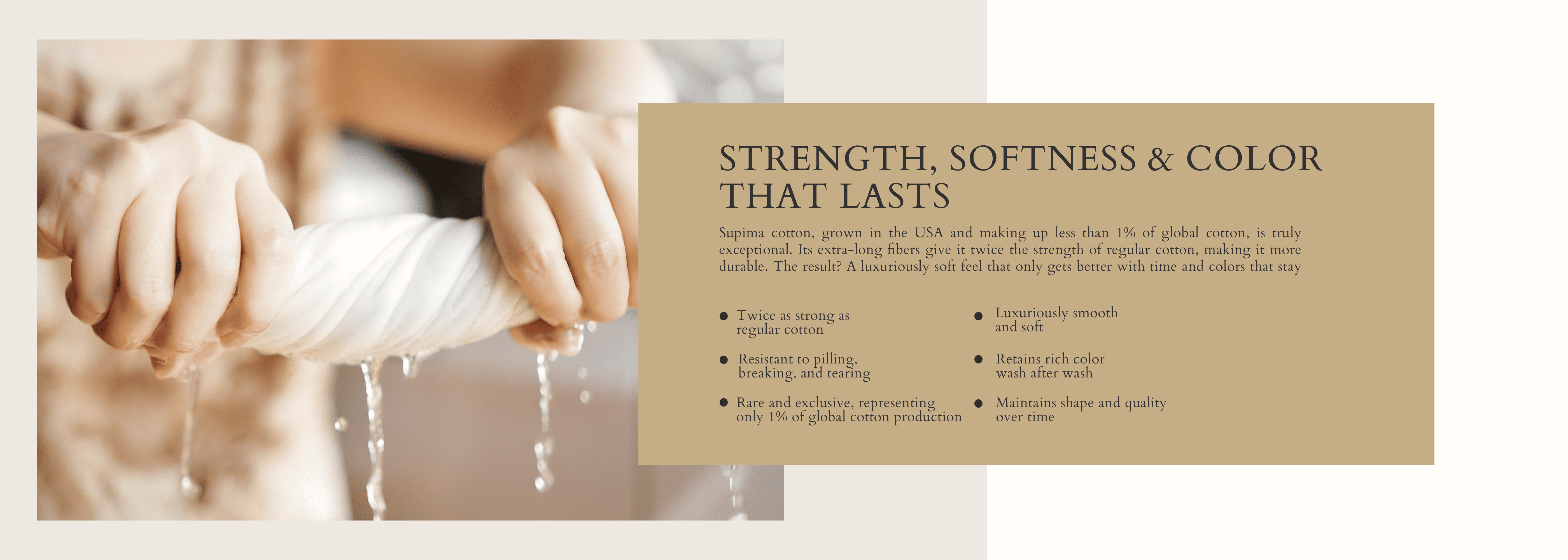 Supima cotton fibers are extra-long-staple (ELS), making them finer, smoother, and softer than regular cotton. This results in a luxurious feel that improves with each wash.